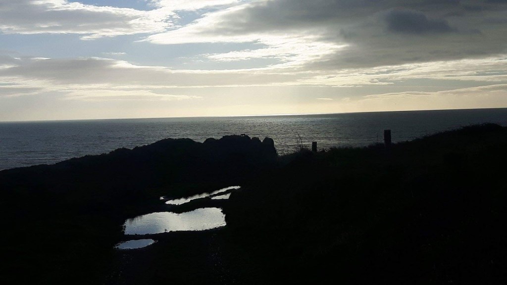 An archipelago of silver lakes, phosphoresecent rain puddles stretch like stepping stones along the cliff edge. Thinly traced lines link old mining villages of the Copper Coast. Fringing steep precipices above the Atlantic, we nervously edge past mine shafts and crumbling walls. Rumours of an ancient church keep us searching for imprints upon stones tumbling towards the sea.